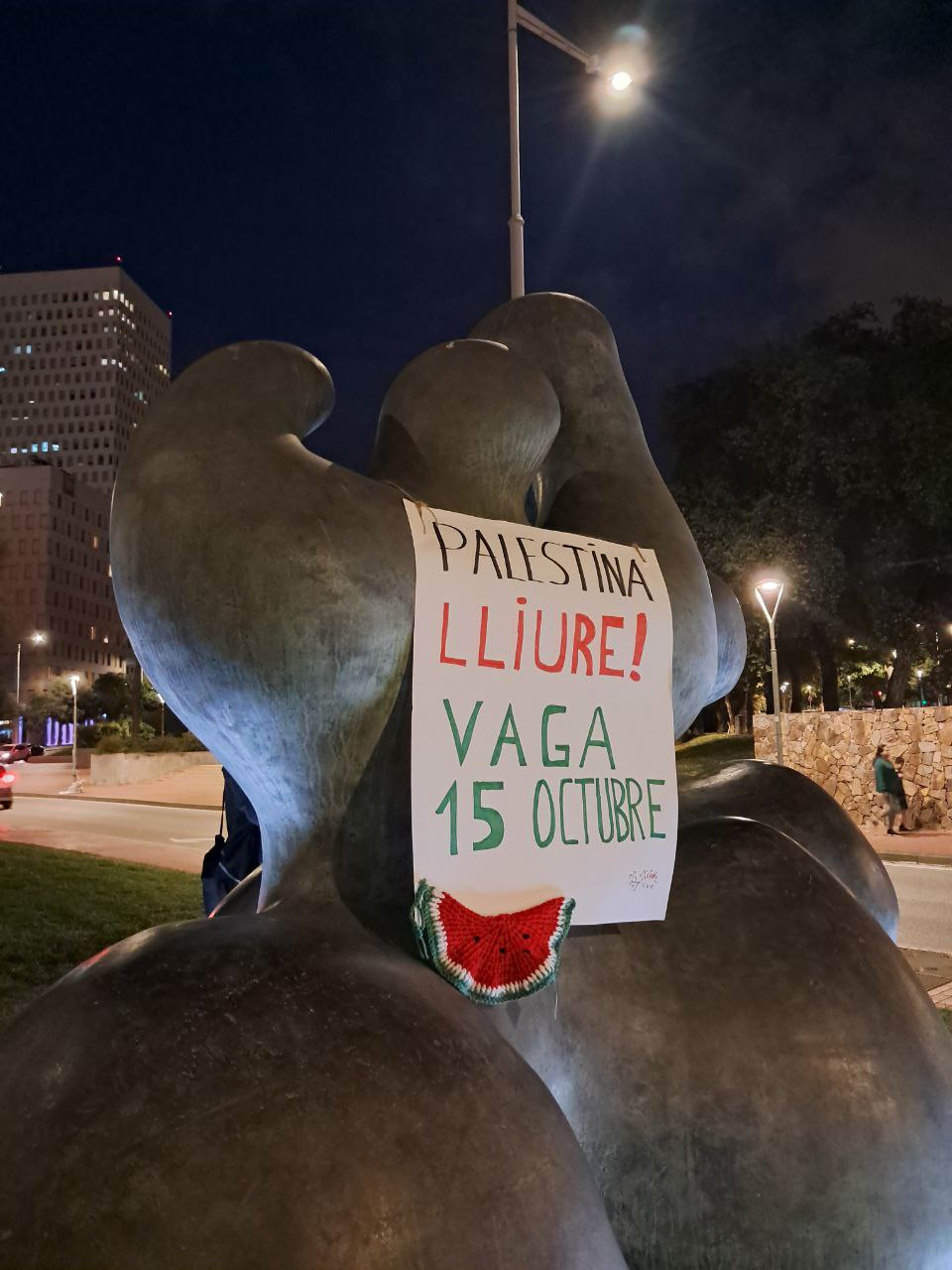 Escup! hem penjat cartells a les principals estàtues i escultures de la ciutat per convocar a la vaga d’aquest dimecres, 15 d’octubre, per demanar la fi del genocidi i l’ocupació del poble palestí en mans de l’estat d’Israel.