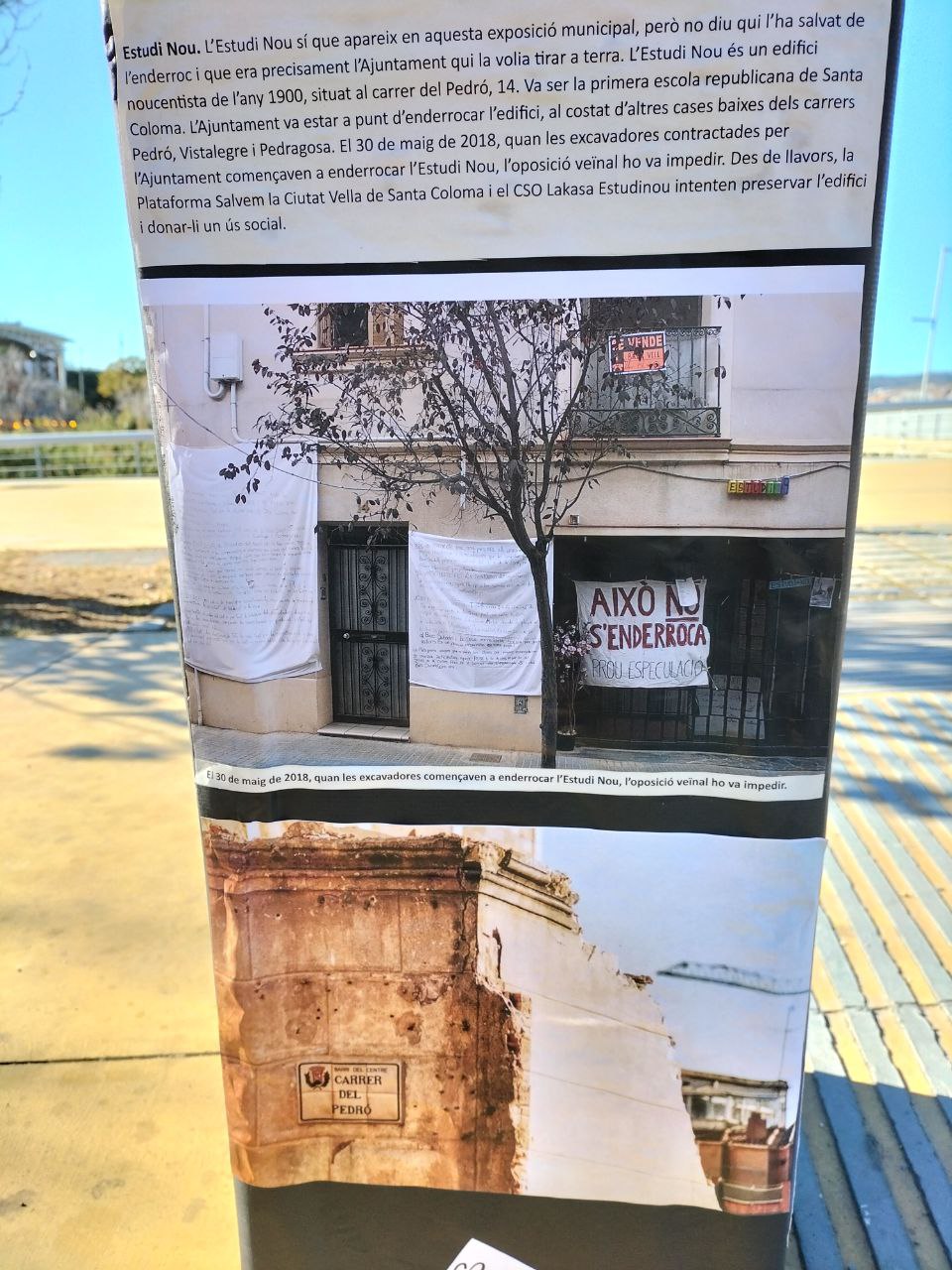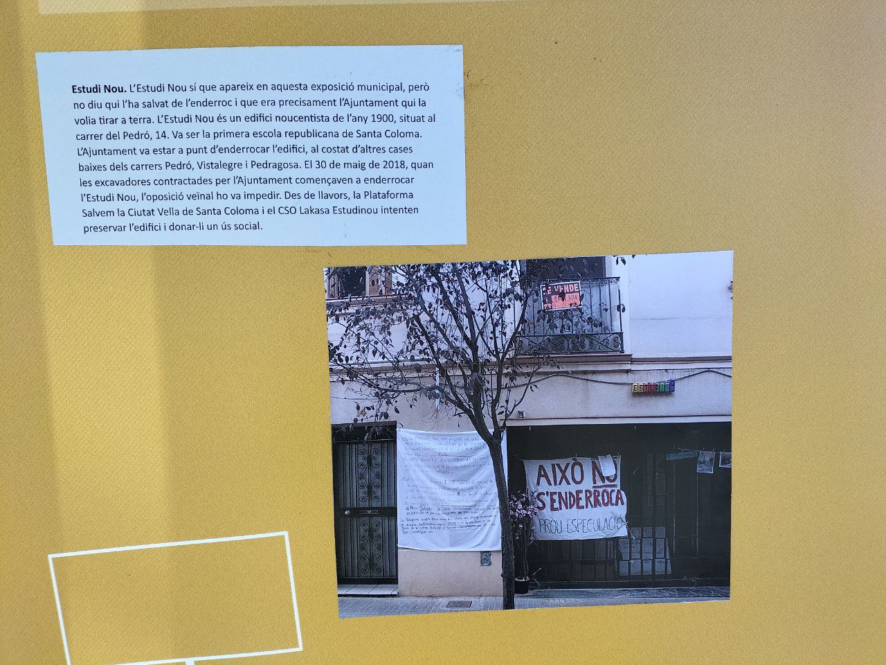 Estudi Nou. L’Estudi Nou sí que apareix en aquesta exposició municipal, però no diu qui l’ha salvat de l’enderroc i que era precisament l’Ajuntament qui la volia tirar a terra. L’Estudi Nou és un edifici noucentista de l’any 1900, situat al carrer del Pedró, 14. Va ser la primera escola republicana de Santa Coloma. L’Ajuntament va estar a punt d’enderrocar l’edifici, al costat d’altres cases baixes dels carrers Pedró, Vistalegre i Pedragosa. El 30 de maig de 2018, quan les excavadores contractades per l’Ajuntament començaven a enderrocar l’Estudi Nou, l’oposició veïnal ho va impedir. Des de llavors, la Plataforma Salvem la Ciutat Vella de Santa Coloma i el CSO Lakasa Estudinou intenten preservar l’edifici i donar-li un ús social.
