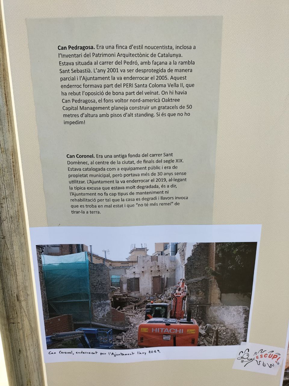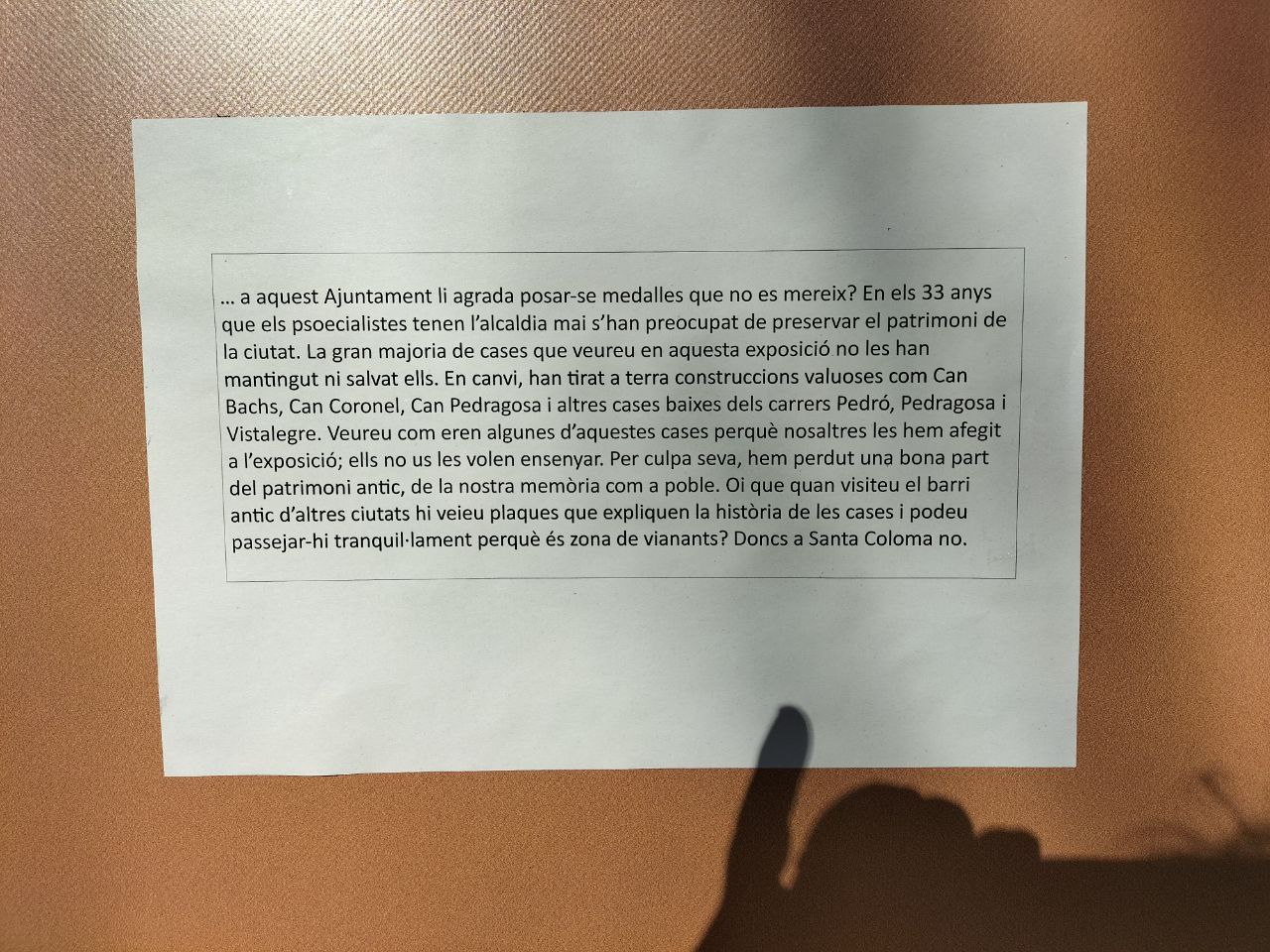 📢 SABIES QUE… a aquest Ajuntament li agrada posar-se medalles que no es mereix? En els 33 anys que els psoecialistes tenen l’alcaldia mai s’han preocupat de preservar el patrimoni de la ciutat. La gran majoria de cases que veureu en aquesta exposició no les han mantingut ni salvat ells. En canvi, han tirat a terra construccions valuoses com Can Bachs, Can Coronel, Can Pedragosa i altres cases baixes dels carrers Pedró, Pedragosa i Vistalegre. Veureu com eren algunes d’aquestes cases perquè nosaltres les hem afegit a l’exposició; ells no us les volen ensenyar. Per culpa seva, hem perdut una bona part del patrimoni antic, de la nostra memòria com a poble.
