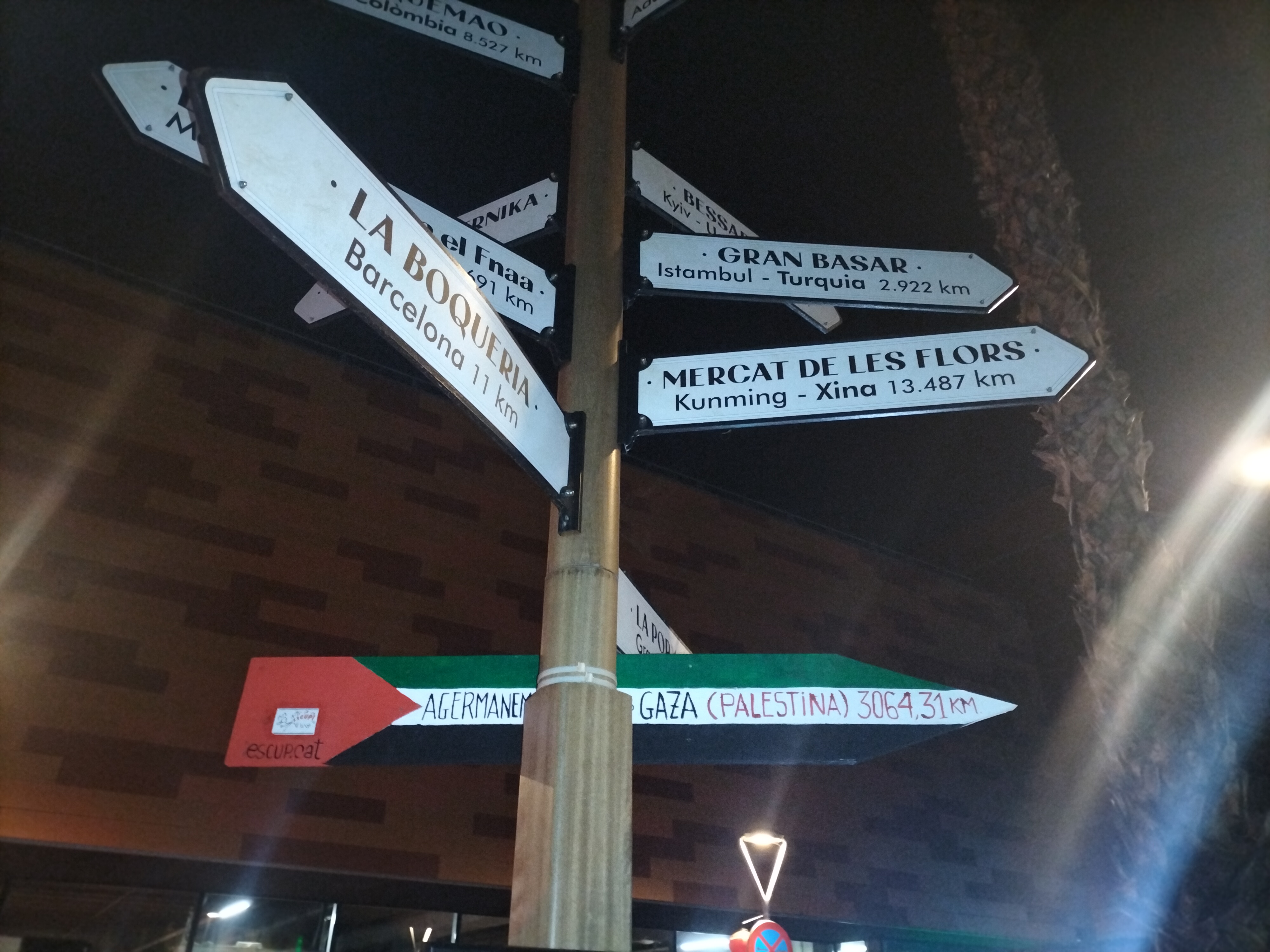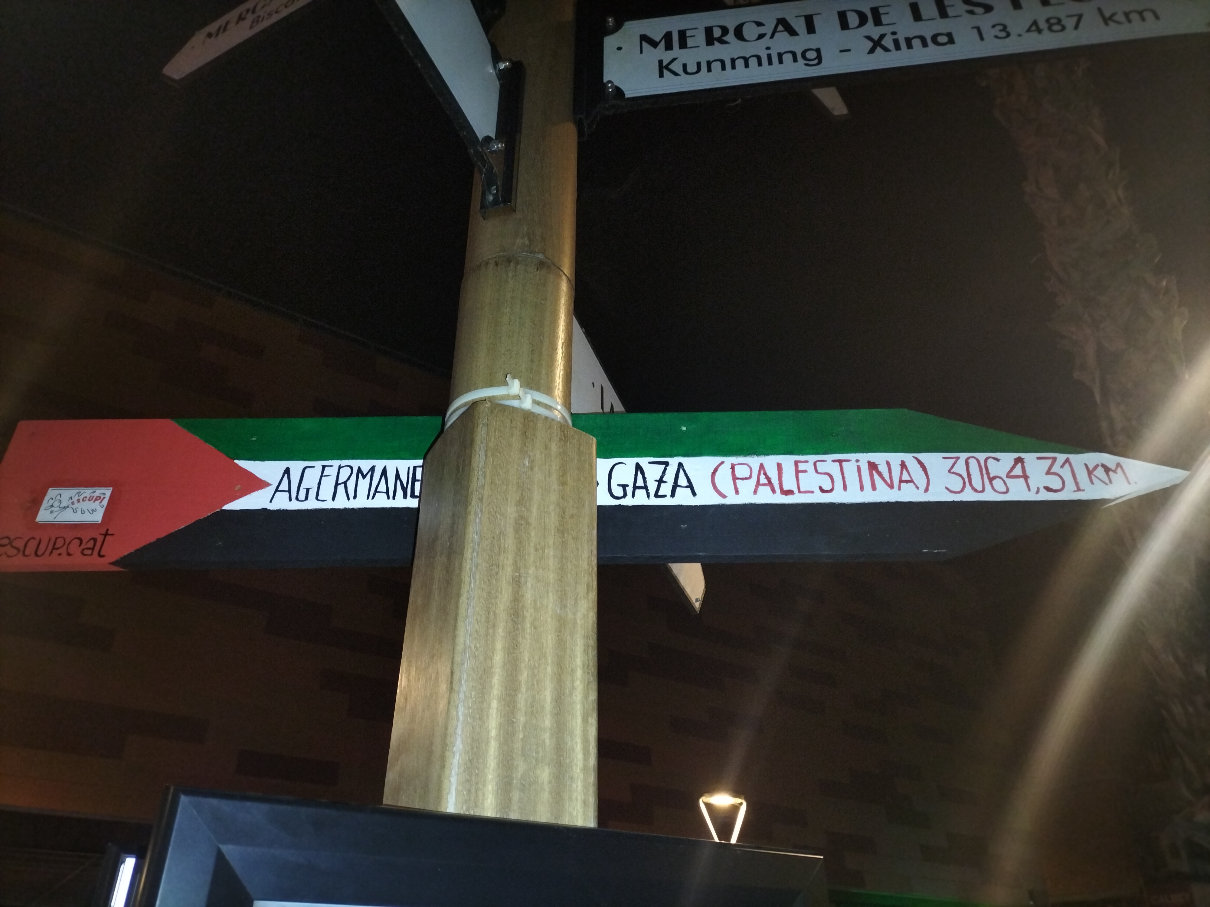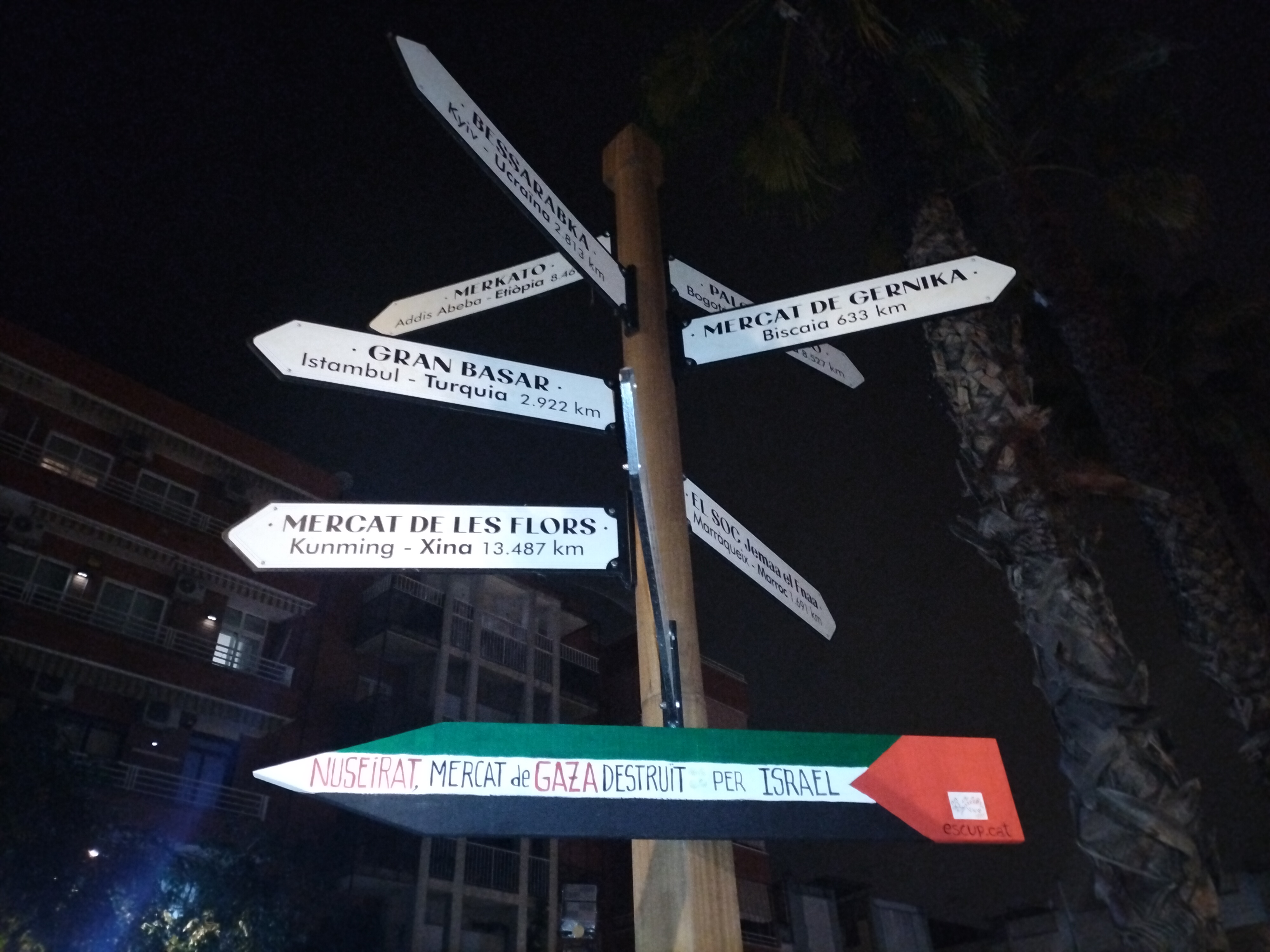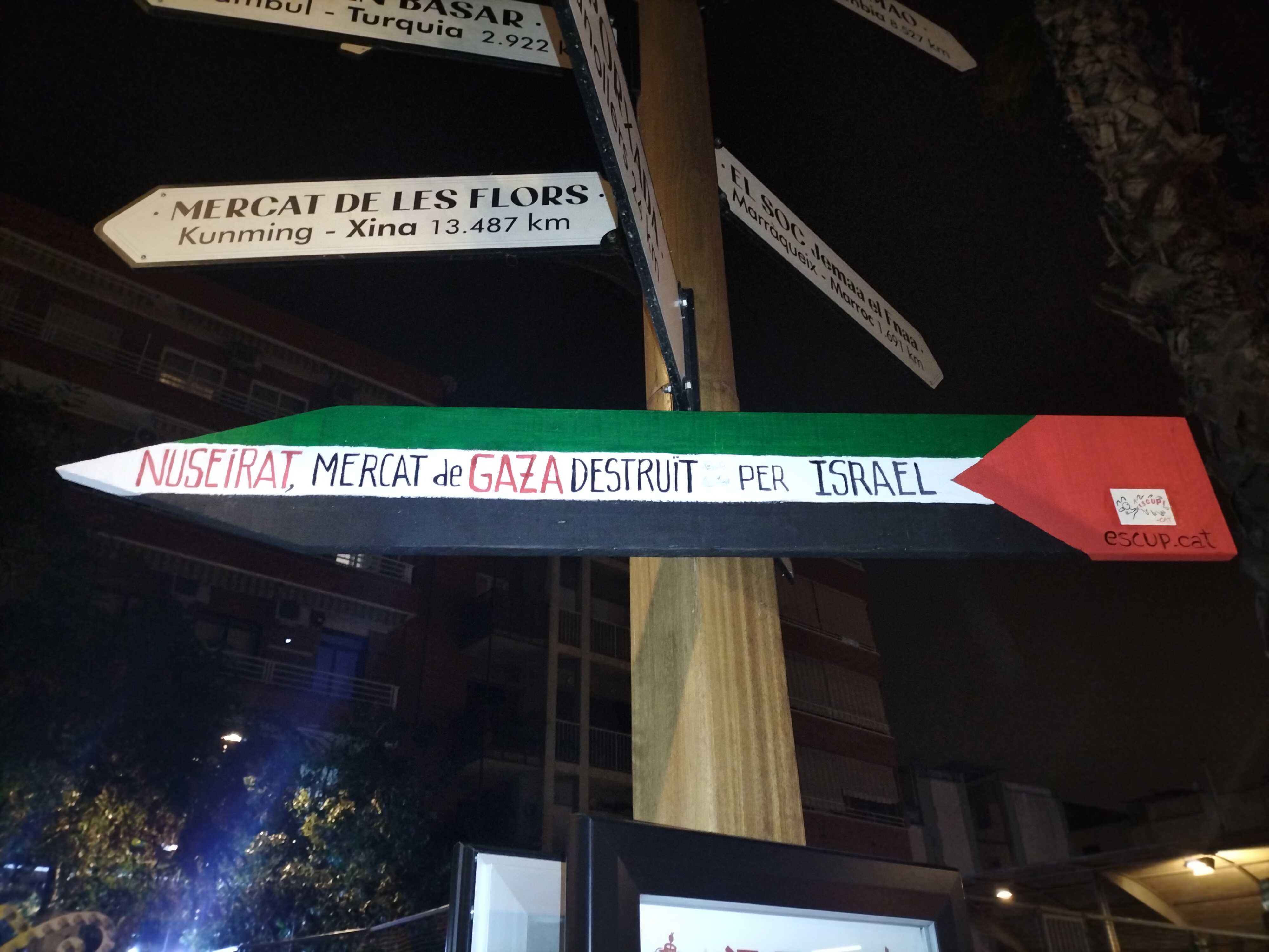 Als indicadors sobre mercats del món que hi ha davant el mercat del Fondo (Santa Coloma de Gramenet), Escup! n’hem afegit un de nou, aquest sobre el mercat al camp de refugiats de Nuseirat, a la ciutat de Gaza, que va ser destruït per l’exèrcit israelià el 23 d’octubre passat. Amb aquesta acció volem denunciar el genocidi que està cometent Israel contra el poble palestí i la complicitat dels estats occidentals davant la violació diària dels drets humans més elementals per part de l’exèrcit israelià.