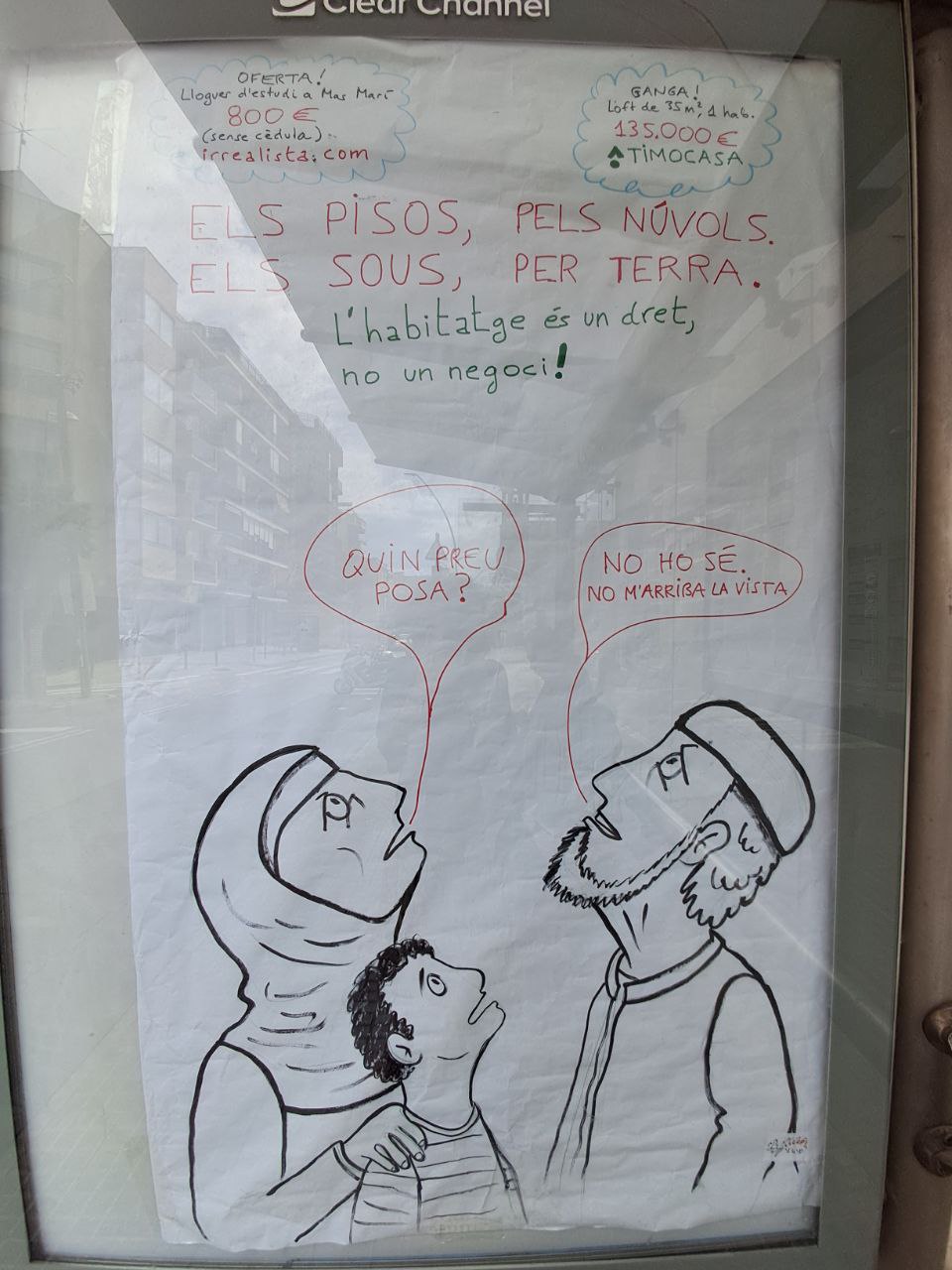 Acostumats com estem a ser bombardejats per publicitat de tota mena, les persones que passegin pels voltants de l’Església Major potser se sorprendran de trobar alguns plafons publicitaris on, en comptes d’intentar vendre’ns el perfum més seductor o l’últim model de cotxe, apareix una família preocupada perquè el preu dels pisos està pels núvols.
