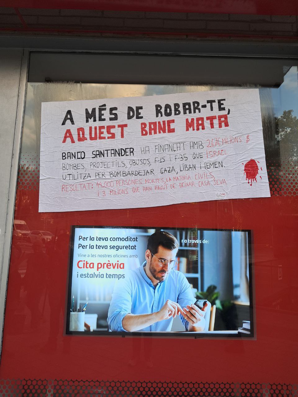 Banc Santander ha finançat ab 2.676 milions de dòlars bombes, projectils, obusos, F-15 i F-35 que Israel empra per bombardejar Gaza, Líban i Iemen.